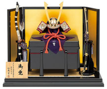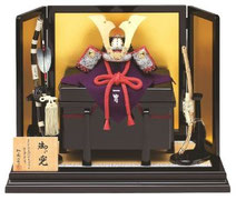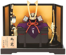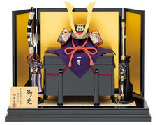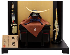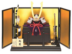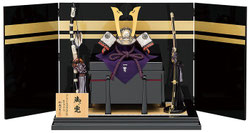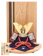 一冑作「兜飾りセット」は兜本体・弓太刀・屏風・飾り台の一式。本格的な兜の魅力を最大限に引き立てる組み合わせとしてシンプルな屏風を中心にセッティングしています。